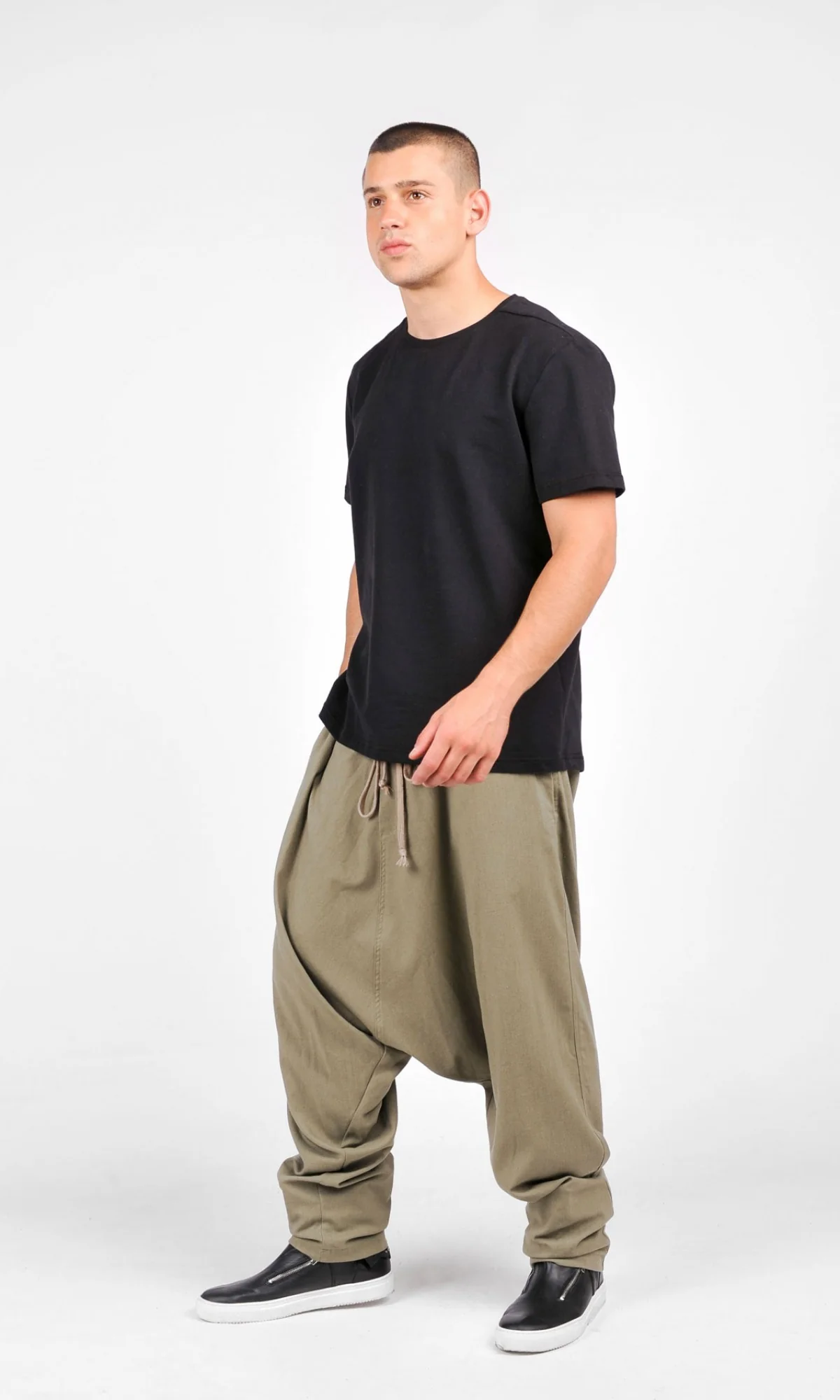 A deep drop crotch pants with an elastic waistband. The distinctive drop crotch silhouette provides a modern and relaxed fit, offering both comfort and a unique, edgy style. Ideal for various activities, from casual outings to lounging at home.
