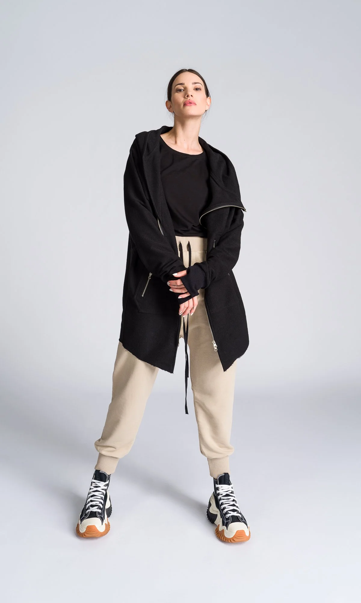 A hooded sweatshirt with asymmetric closure and thumbholes. Designed to elevate your casual look, whether you're heading to the gym, running errands, or just chilling with friends.