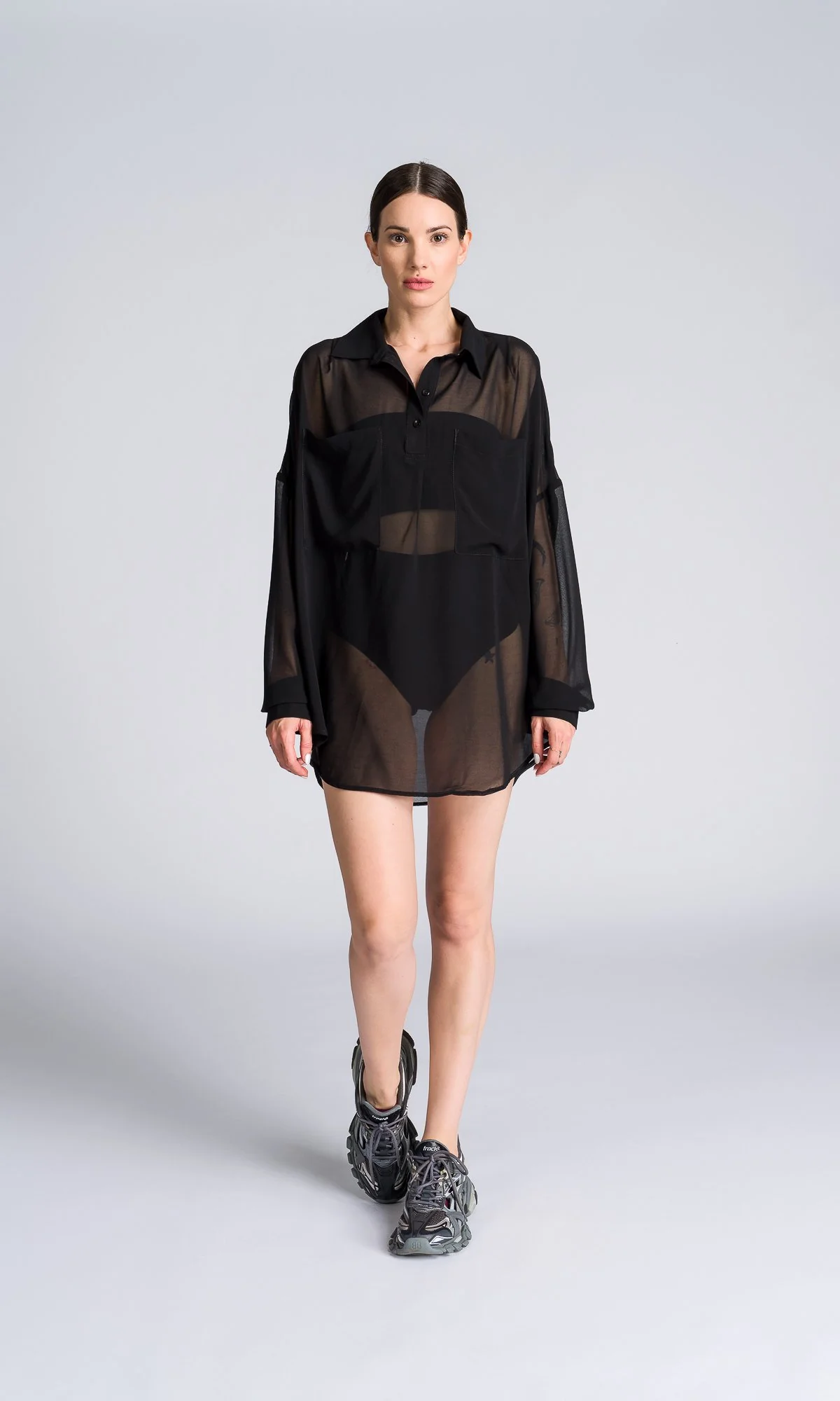 A long-sleeves shirt with delicate see-through chiffon fabric and elongated silhouette that creates an ethereal and flattering appearance. Your new go-to choice for all occasions, from romantic dinners to stylish gatherings with friends. Be bold and style it to your taste.