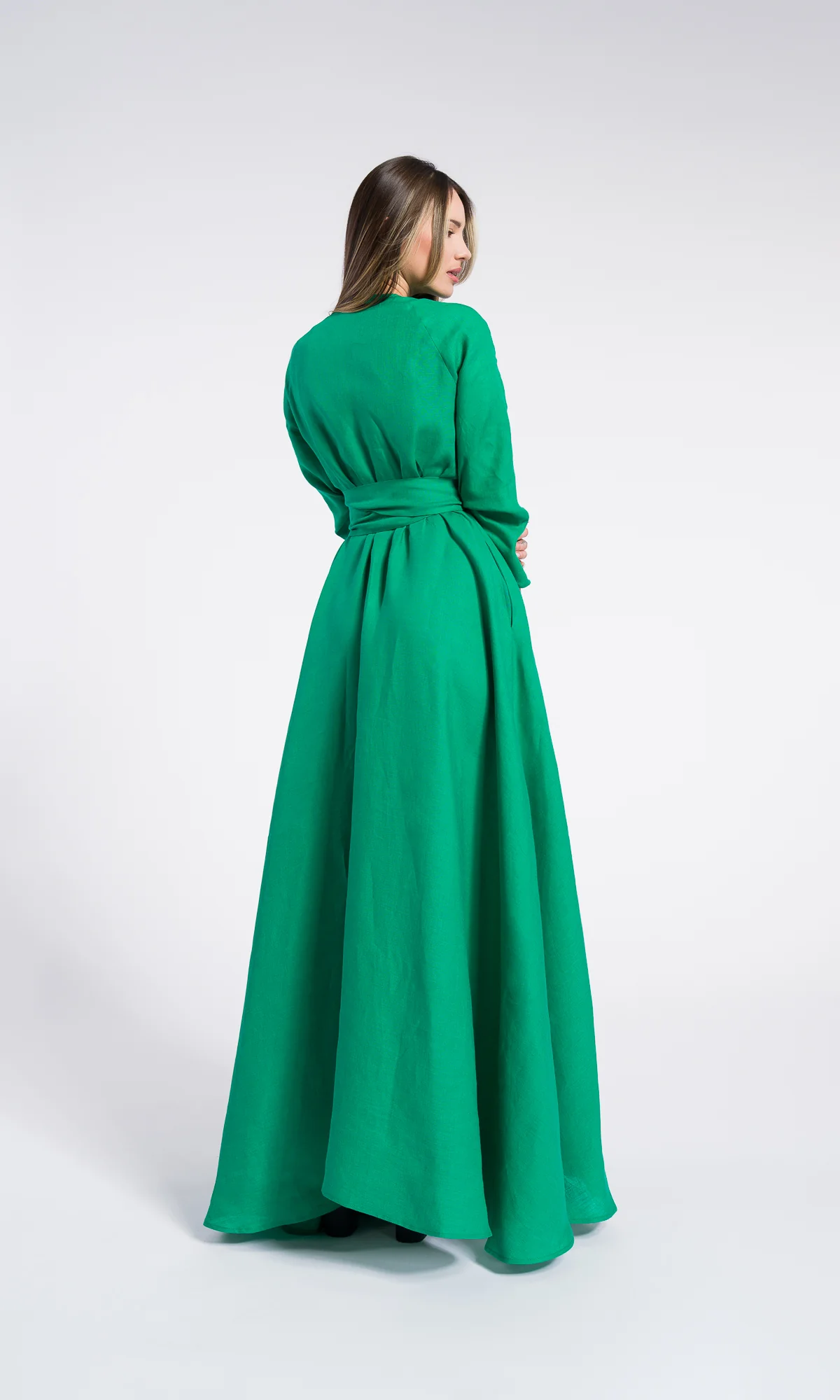 Maxi linen wrapped dress with belt and pockets , Summer long sleeves Dress, Party dress , Bohemian Flowing Dress