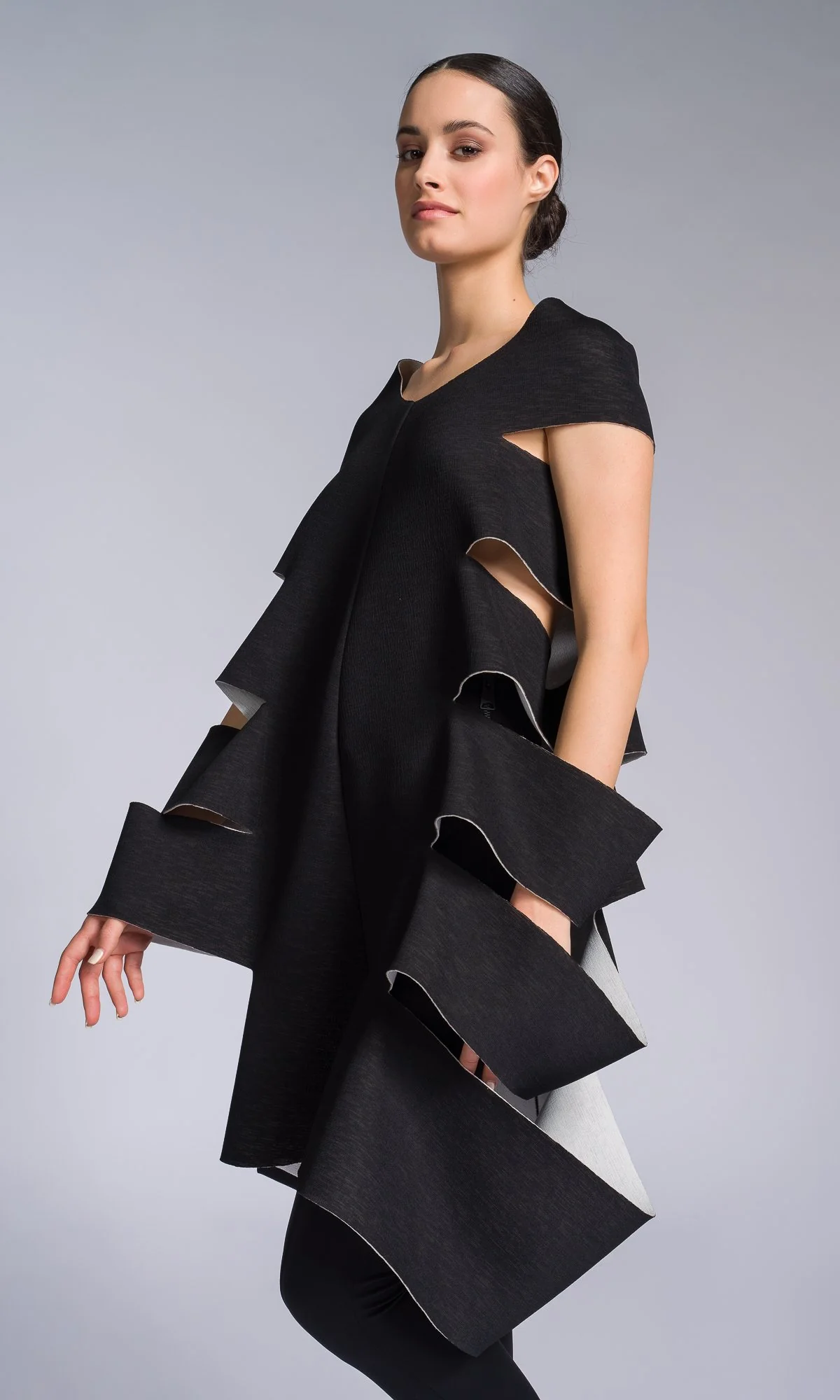 An original neoprene top with many side cutouts that forms an interesting trapeze silhouette. A perfect fit for every body type. Its design makes it easy to pair with various long or short bottoms and accessories.
