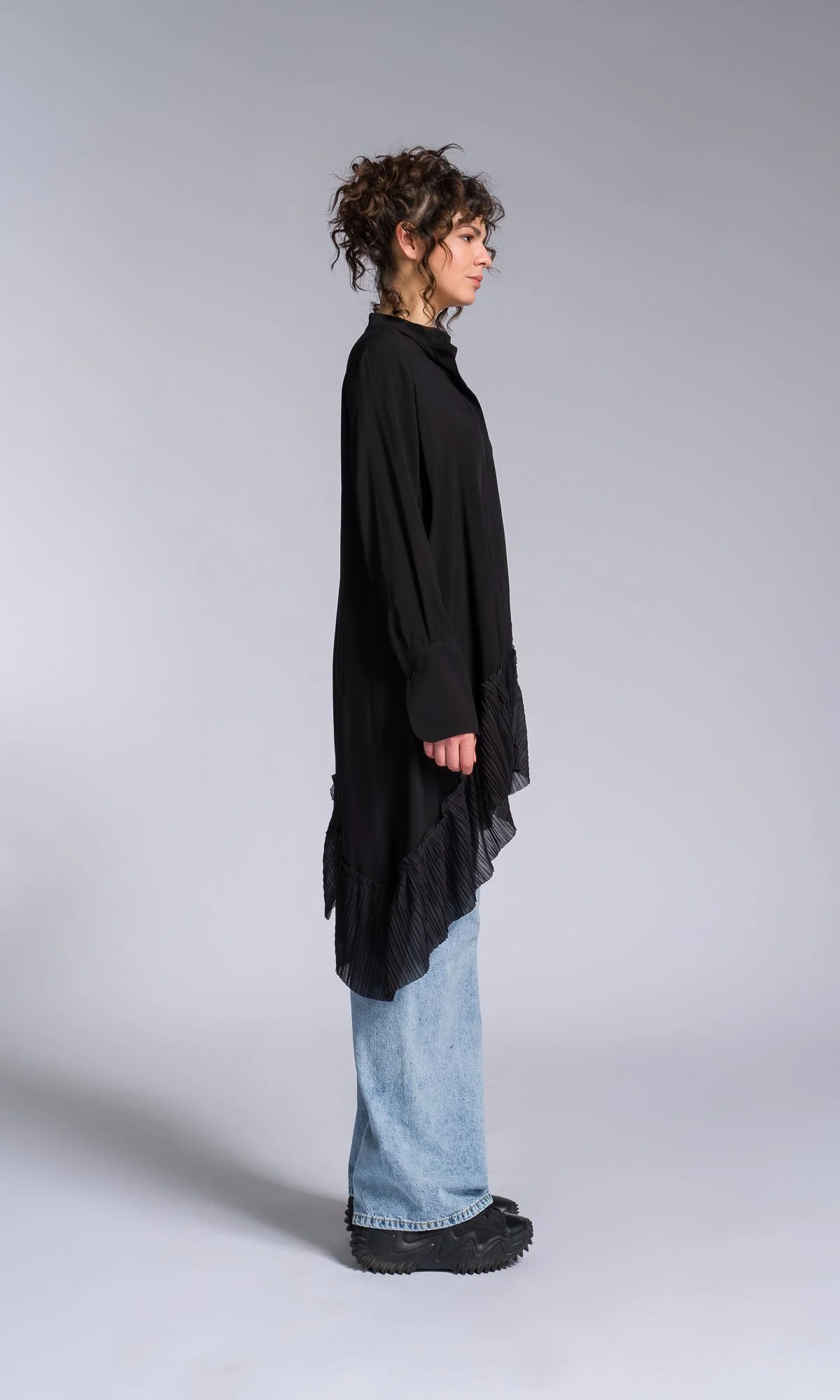An elegant asymmetric shirt that falls freely on the body. Finished with pleated sheer hem, it ads some original and extraordinary appearance to your outfit. It suits different styles and tolerates fashion experiments.