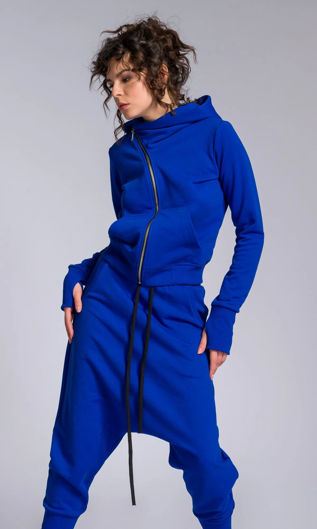A matching set of cotton deep drop crotch pants with rib knit cuffs and short hoodie with asymmetric closure.